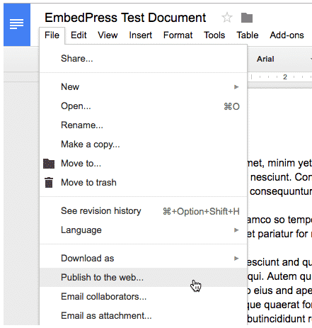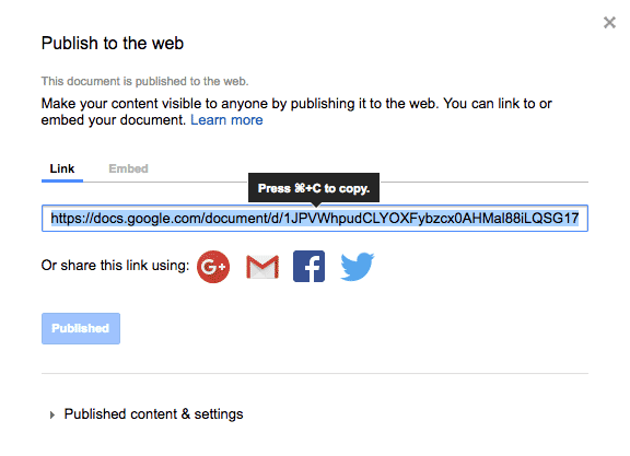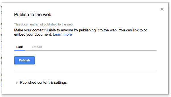 Before we can embed your Google Docs into your website, you need to make sure that it is published and visible to the public.